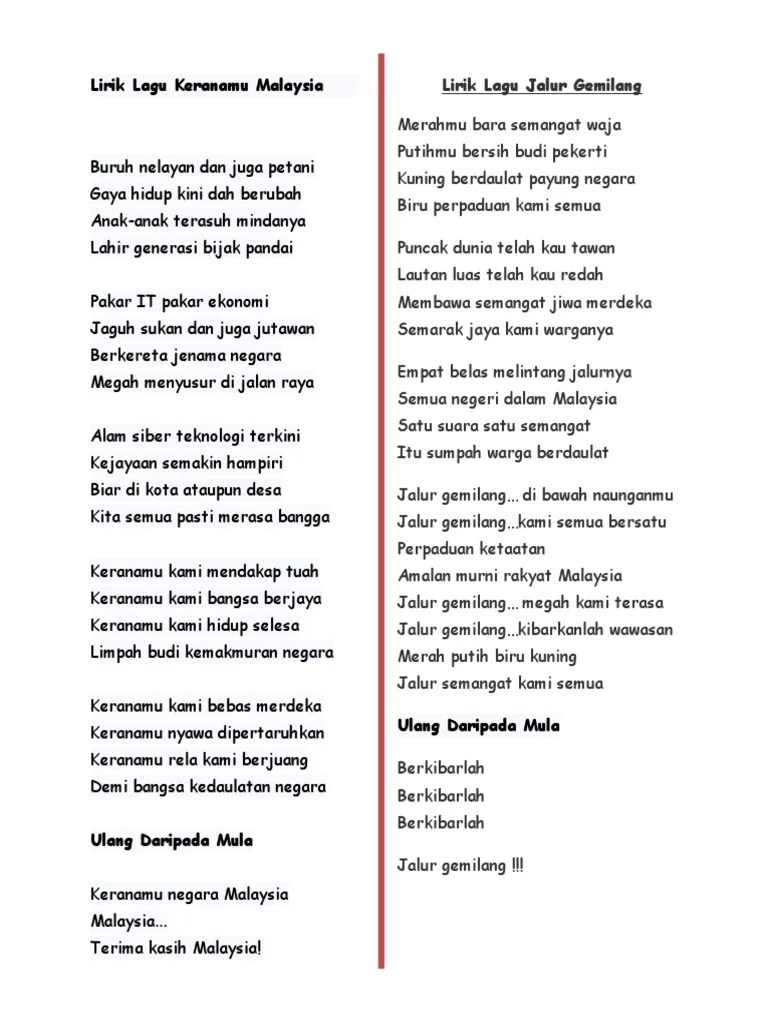 Walaupun penulis sendiri tidak faham maksud lirik lagu tersebut. Menghafal lirik lagu keranamu malaysia? Sejarah lagu negaraku, lirik lagu, latarbelakang pencipta lirik lagu kebangsaan, serta info yang berkaitan untuk muat turun.